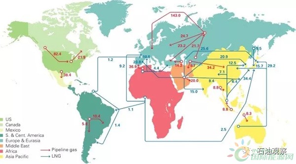 圖 2016年世界主要天然氣貿(mào)易情況(單位為十億立方英尺)