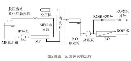 微濾技術(shù)高效的固液分離性能、較大的膜通量和良好穩(wěn)定性,近年來受到了越來越多的關(guān)注。將微濾與反滲透相結(jié)合而形成的雙膜污水深度處理工藝在垃圾滲濾液、造紙廢水以及再生水工程中的應用也十分成功。然而,對于水質(zhì)復雜的脫硫廢水,采用雙膜組合工藝處理時,其系統(tǒng)運行穩(wěn)定性以及出水水質(zhì)有待進一步研究。