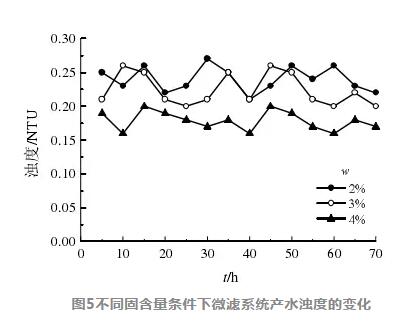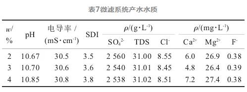 由圖5和表7可知,微濾系統(tǒng)產(chǎn)水濁度在0.16~0.3 NTU小幅波動,膜污染指數(shù)SDI小于3.8。隨著固含量的升高產(chǎn)水濁度略有降低、SDI略有上升??傮w來看系統(tǒng)運行穩(wěn)定,而且SS的質(zhì)量分數(shù)為3%時的產(chǎn)水通量最大,產(chǎn)水量穩(wěn)定時間更長。