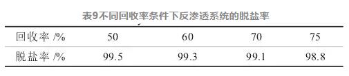 綜合考慮反滲透系統(tǒng)的運行壓力、回收率和脫鹽率等因素,確定系統(tǒng)在回收率為70%條件下運行時效果最好,此時操作壓力為8.0MPa,產(chǎn)出的淡水、濃水總鹽的質(zhì)量濃度分別為 114.6、0.4 g/L。
