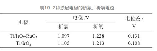 在電解制氯過程中,陽極上發(fā)生的析氧反應是析氯反應的主要競爭副反應,它不僅消耗電能,還降低制氯效率,因此陽極材料上發(fā)生的析氧反應越小越有利于析氯反應的進行。實驗對預選的2種涂層材料的陽極進行了析氯、析氧電位測定,結(jié)果如表10所示。