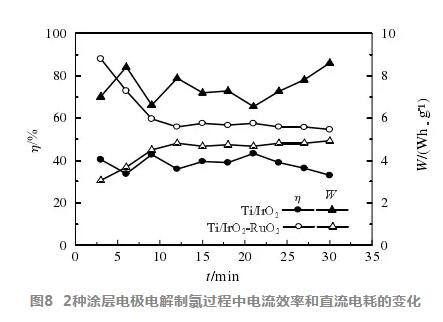 由圖8可知,Ti/IrO2涂層電極的電流效率和直流電耗分別為40%、7.9 kW.h/kg,Ti/IrO2-RuO2涂層 電極的分別為60%、4.5 kW.h/kg。Ti/IrO2涂層電極的電流效率明顯低于Ti/IrO2-RuO2涂層電極,直流電耗大大高于Ti/IrO2-RuO2涂層電極。原因是Ti/ IrO2涂層電極析氯反應進行得較差,隨著電解液中Cl-含量下降導致傳質(zhì)效率下降,電流效率開始逐步 下降,直流電耗逐漸升高。電解過程中電解液溫度略 有升高也是一個原因。