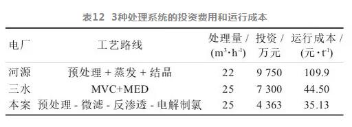 河源某電廠是國內(nèi)第1家真正意義上實現(xiàn)廢水零排放的電廠,采用了 “預處理+蒸發(fā)+結(jié)晶”工 藝,三水某電廠采用“預處理+臥式MVC濃縮+臥式MED結(jié)晶”工藝,他們與本研宄的“預處理-微濾-反滲透-電解制氯”投資及運行成本的比較見表12。