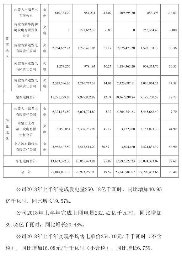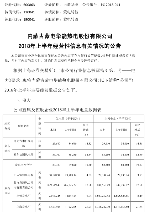 近日,華能集團(tuán)旗下上市公司內(nèi)蒙華電發(fā)布了2018年上半年經(jīng)營性信息有關(guān)情況公告。內(nèi)蒙華電2018年上半年完成發(fā)電量250 18億千瓦時(shí),同比增加