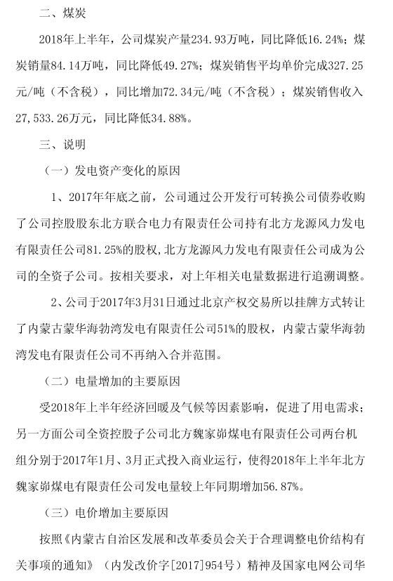 受2018年上半年經(jīng)濟(jì)回暖及氣候等因素影響,促進(jìn)了用電需求;另一方面公司全資控股子公司北方魏家峁煤電有限責(zé)任公司兩臺機(jī)組分別于2017年1月、3月正式投入商業(yè)運(yùn)行,使得2018年上半年北方魏家峁煤電有限責(zé)任公司發(fā)電量較上年同期增加56.87%。