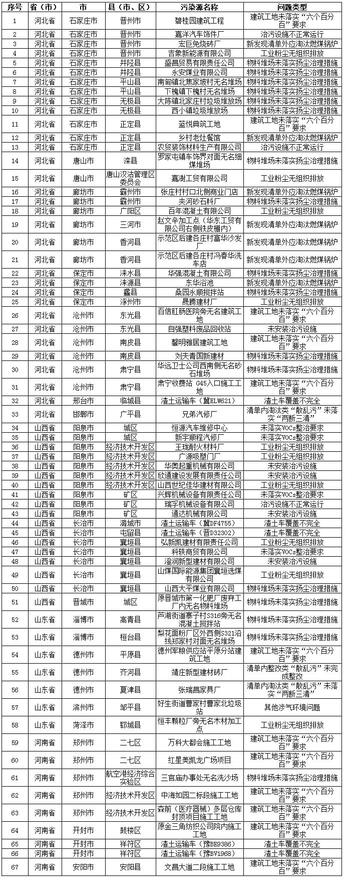 督查組檢查發(fā)現(xiàn),清單內(nèi)涉氣“散亂污”企業(yè)存在整改不到位問題3家。其中,河北省邯鄲市廣平縣1家;山東省德州市齊河縣1家、夏津縣1家。