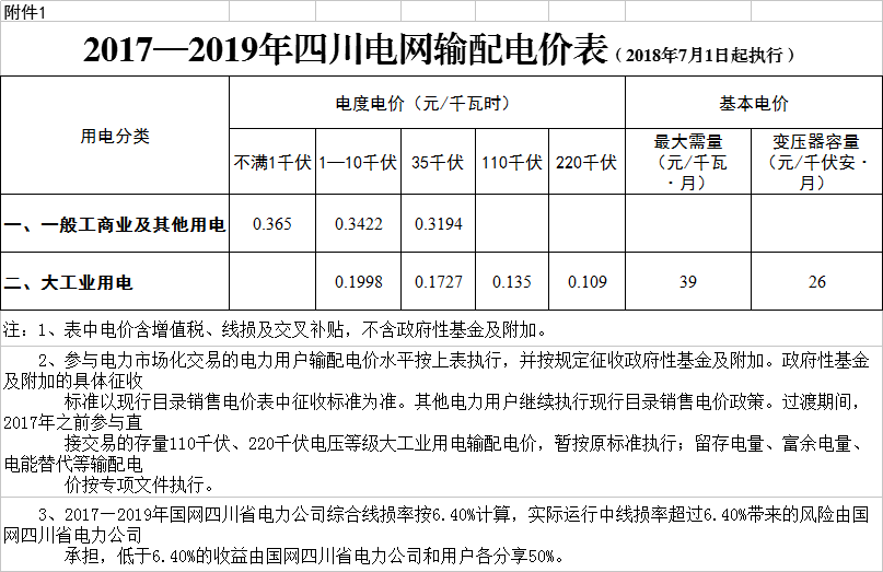 附件:1.四川電網輸配電價表(2018年7月1日起執(zhí)行) 2.四川電網銷售電價表(2018年7月1日起執(zhí)行) 3.四川電網躉售電價表(2018年7月1日起執(zhí)行)