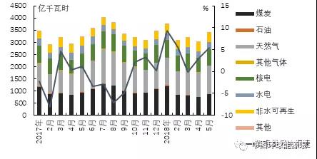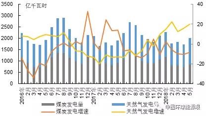 2018年5月,美國凈發(fā)電量為3390.6億千瓦時(shí),同比增長5.4%,較上月提高2.5個(gè)百分點(diǎn)。常規(guī)能源發(fā)電中煤炭發(fā)電量持續(xù)減少,為854億千瓦時(shí),同比減少8.3%;天然氣發(fā)電量為1156億千瓦時(shí),同比增長20.0%,增速提高。