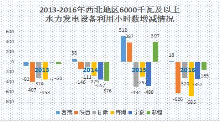 該區(qū)域?yàn)辄S河上游、黃河北干流水電基地所在地,是全國范圍內(nèi)6000千瓦及以上水力發(fā)電設(shè)備平均利用小時(shí)數(shù)下滑最為嚴(yán)重的地區(qū)。在本地消納不足、外送阻塞的情況下,部分省份6000千瓦及以上水力發(fā)電設(shè)備平均利用小時(shí)數(shù)下滑幅度較高,2016年陜西省水電平均利用小時(shí)數(shù)僅為2437小時(shí),青海為2572小時(shí)。