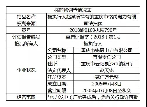 拍賣 | 任某所持有的重慶市銘禹電力公司16.665%的股權(quán) 12月10日開拍
