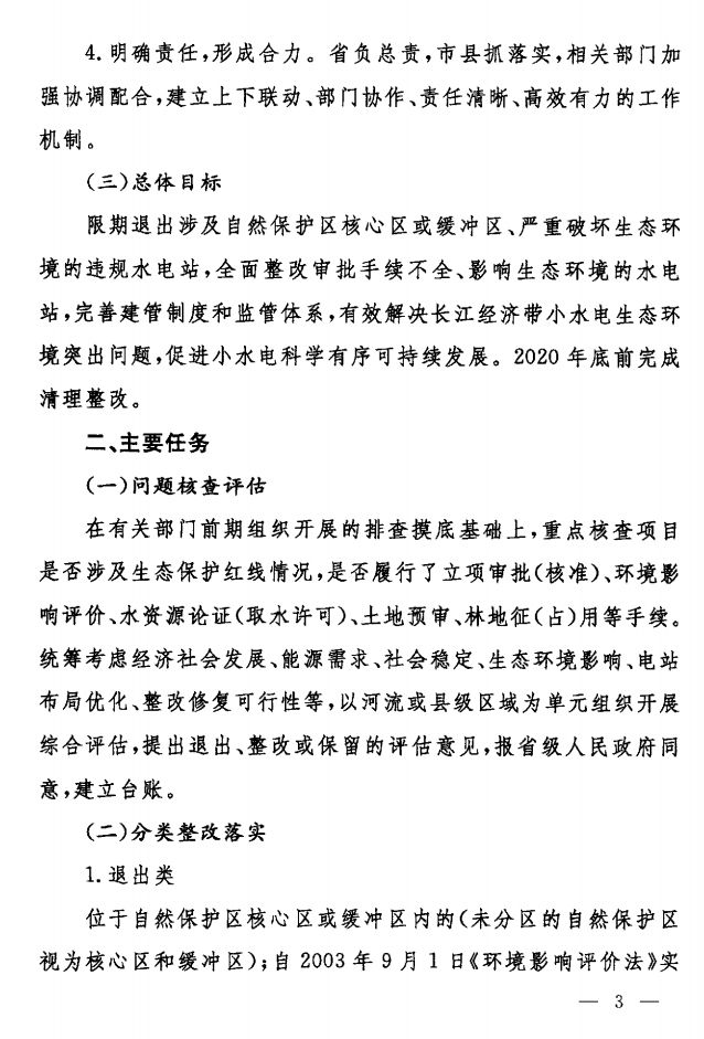 總體目標(biāo):限期退出涉及自然保護(hù)區(qū)核心區(qū)或緩沖區(qū)、嚴(yán)重破壞生態(tài)環(huán)境的違規(guī)水電站,全面整改審批手續(xù)不全、影響生態(tài)環(huán)境的水電站,完善建管制度和監(jiān)管體系,有效解決長江經(jīng)濟帶小水電生態(tài)環(huán)境突出問題,促進(jìn)小水電科學(xué)有序可持續(xù)發(fā)展。2020年底前完成清理整改。