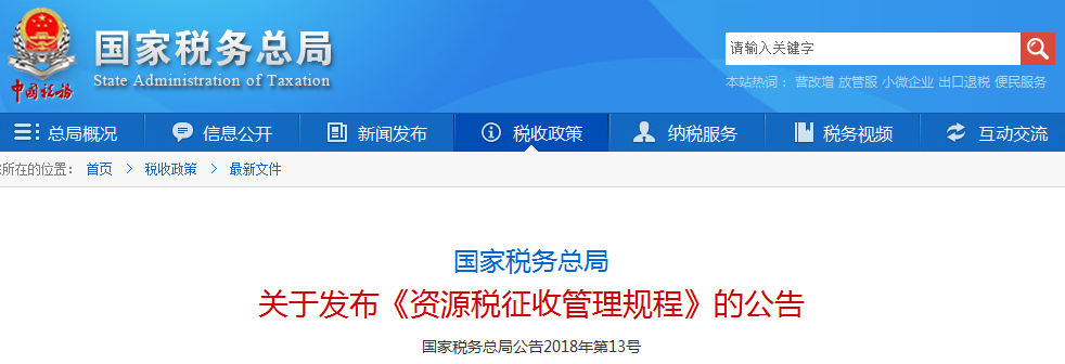 為進(jìn)一步規(guī)范資源稅征收管理,優(yōu)化納稅服務(wù),防范涉稅風(fēng)險(xiǎn),國家稅務(wù)總局研究制定了《資源稅征收管理規(guī)程》,現(xiàn)予發(fā)布,自2018年7月1日起施行。