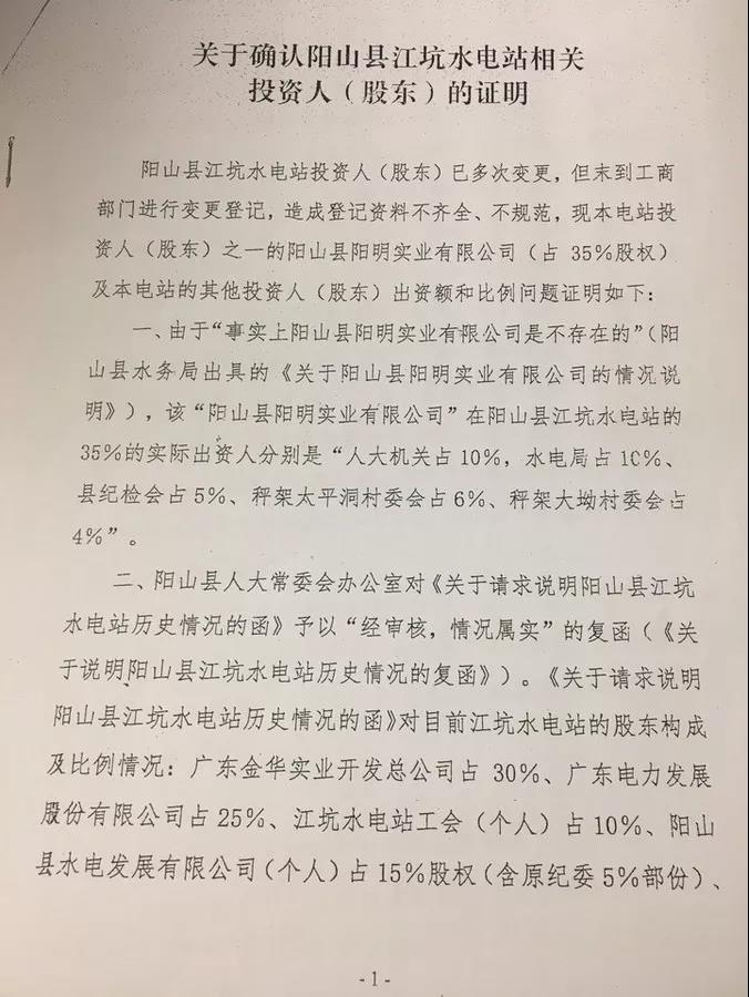 根據(jù)陽山縣江坑水電站股東會議于1994年12月1日通過的水電站章程及銀行付款憑證,廣東金華實業(yè)開發(fā)總公司投入江坑水電站的初始資金為600萬元,根據(jù)陽山縣江坑水電站董事會決議,1996年分紅擴股85.10萬元,2014年和2015年投入增效擴容資金206.459158萬元。廣東金華實業(yè)開發(fā)總公司投資陽山江坑水電站金額共計8,915,591.58元,股比份額30%。
