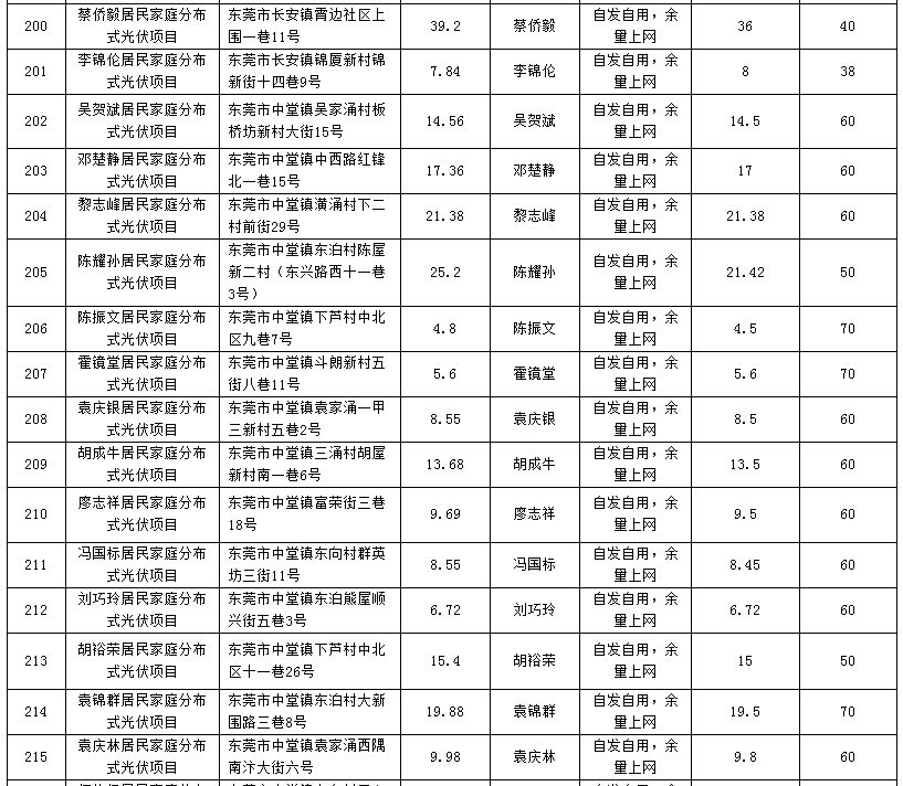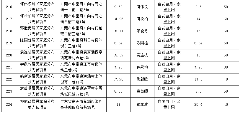 廣東東莞224個(gè)家庭分布式光伏項(xiàng)目備案信息表