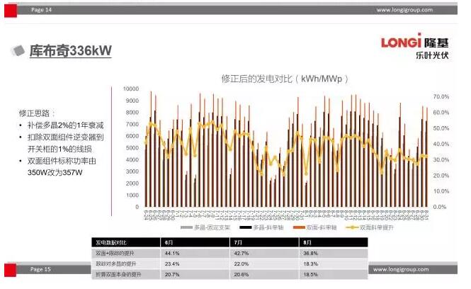 隆基樂葉在草和土的混合地面條件下,在組件安裝高度1.3米時(shí),在17年5~6月雙面PERC組件相對常規(guī)單晶多發(fā)電比例為12%。而在庫布奇336kW的客戶項(xiàng)目中,雙面組件配合跟蹤支架在6~8月實(shí)現(xiàn)了40%左右的發(fā)電量提升(相對常規(guī)多晶)。