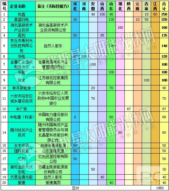 下表為獲得集中式地面電站扶貧指標(biāo)的Top20企業(yè)統(tǒng)計