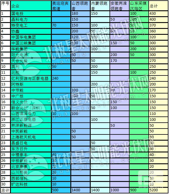 下表格為各企業(yè)所獲指標(biāo)的容量以及排名