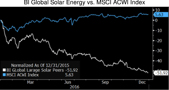 據(jù)彭博行業(yè)研究平臺消息,2016年,全球大型太陽能行業(yè)集團股價下跌幅度達52%,表現(xiàn)不佳,同期MSCIACWI指數(shù)上漲幅度為5.6%。美國光伏巨頭SunEdison在去年4月份提交破產(chǎn)保護申請,加重了行業(yè)內(nèi)的消極情緒,與此同時,美國住宅用太陽能設(shè)備發(fā)展速度緩慢,2017年相關(guān)項目數(shù)量降低。除此之外,中美貿(mào)易持續(xù)的緊張局勢、中國2020年增長目標放緩以及去年下半年開始的國內(nèi)太陽能設(shè)備需求放緩給那些面向中國市場的設(shè)備生產(chǎn)商帶來壓力,這些趨勢可能會持續(xù)到2017年。