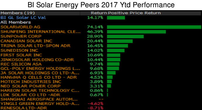 據(jù)彭博行業(yè)研究平臺數(shù)據(jù),繼2016年52%的下跌幅度之后,2017年前兩個月,太陽能行業(yè)集團股價上漲14%。太陽能行業(yè)股市回暖,加之油價恢復到50美元左右,分析師的看法會有所改善。主要面向中國市場的順風國際清潔能源有限公司(shunfeng international clean energy)和阿特斯陽光電力集團(CanadianSolar)寄希望于今年上半年中國太陽能需求能夠增加。FirstSolar和SunPower等美國太陽能同行公司采取的削減成本的舉措也可能會緩和業(yè)內(nèi)對價格和行業(yè)產(chǎn)能過剩的擔憂情緒。