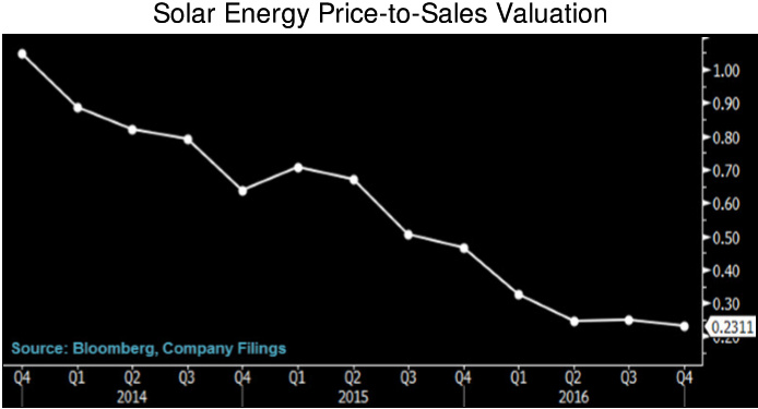 據(jù)彭博行業(yè)研究平臺數(shù)據(jù)顯示,自2015年第四季度以來,全球太陽能行業(yè)集團的股價與銷售額比率中位數(shù)從0.5X下降到0.2x,其中主要原因仍然是由于股價下跌52%。2016年6月底,來自中國的太陽能設(shè)備需求下降,這些太陽能集團收入也開始急劇下滑,這有助于緩解太陽能設(shè)備供過于求的現(xiàn)象。預(yù)期2017年全球太陽能需求放緩,產(chǎn)能增加,會加劇業(yè)內(nèi)對太陽能設(shè)備價格以及生產(chǎn)者利潤空間走低的擔憂情緒。