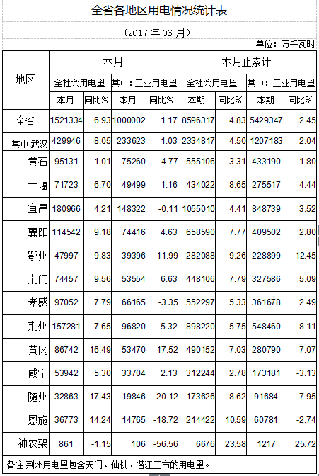 (五)全省13個地區(qū)全社會用電增長,“一主兩副”城市對全省用電增長起到穩(wěn)定基石作用。上半年全省14個用電統(tǒng)計(jì)地區(qū)中,13個地區(qū)全社會用電不同程度增長,僅鄂州1地全社會用電下降;從工業(yè)用電情況看,11個地區(qū)用電增長,鄂州、咸寧、恩施3個地區(qū)下降,主要是當(dāng)?shù)靥蕴浜?、化解過剩產(chǎn)能,關(guān)停或升級改造所致。“一主兩副”城市武漢、宜昌、襄陽3市全社會用電量共404.84億千瓦時,占全省全社會用電量的47.09%,增幅分別為4.50%、4.41%、7.77%,均衡穩(wěn)健,有力支撐了全省用電的增長。