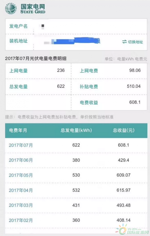 安裝戶用光伏系統(tǒng)的用戶,可以在上面查看自己的光伏賬單,信息包含: