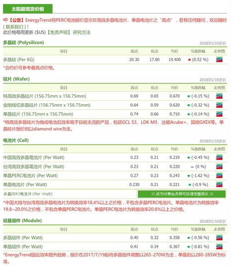 由于一線組件廠訂單仍足夠,單多晶硅片一線廠的價(jià)格仍維持不變,但小型硅片廠已出現(xiàn)拋貨低價(jià),單晶低于RMB5/pc以及多晶低于RMB4.2/pc的價(jià)格,預(yù)期將給1月下旬的市場(chǎng)氛圍造成影響。本周一二線單晶硅片價(jià)格為RMB5.1-5.4/pc,金剛線切多晶硅片則在RMB4.45-4.6/pc。