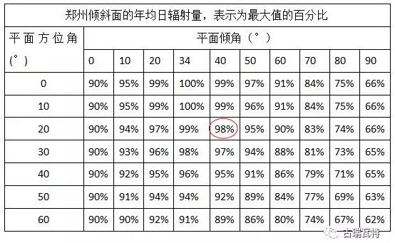 以河南鄭州為例,地位經緯度為北緯36°,東經116°。下圖給出不同朝向傾角的發(fā)電量值,按照最佳傾角最佳發(fā)電量的百分比表示。