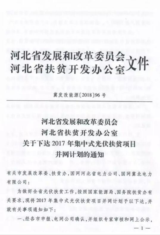 1月29日,河北省發(fā)改委、扶貧辦印發(fā)《關(guān)于下達(dá)2017年集中式光伏扶貧項目并網(wǎng)計劃的通知》?!锻ㄖ分赋?,2017年,河北省計劃集中式光伏扶...