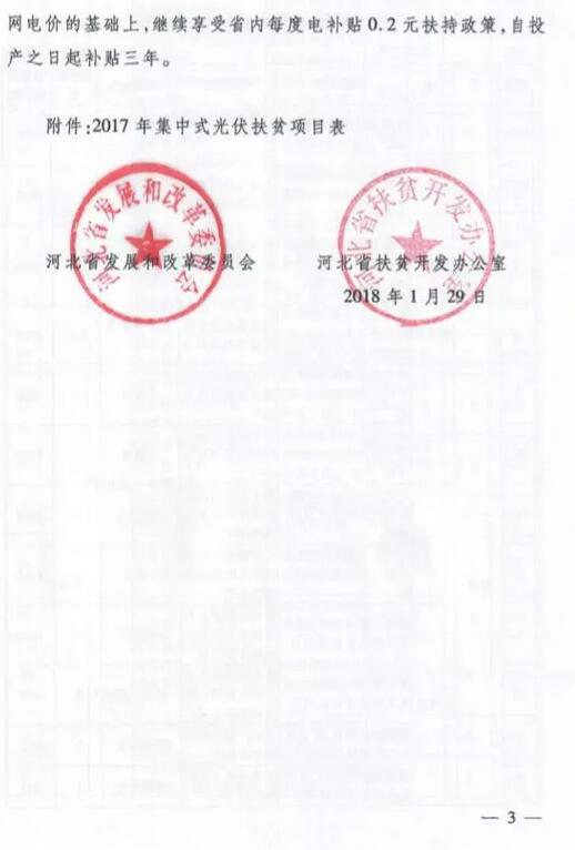 1月29日,河北省發(fā)改委、扶貧辦印發(fā)《關(guān)于下達(dá)2017年集中式光伏扶貧項目并網(wǎng)計劃的通知》。《通知》指出,2017年,河北省計劃集中式光伏扶貧項目并網(wǎng)171萬千瓦,幫扶貧困戶數(shù)58880戶。項目在2018年12月31日前建成并網(wǎng),在執(zhí)行當(dāng)?shù)貥?biāo)桿上網(wǎng)電價的基礎(chǔ)上,繼續(xù)享受省內(nèi)每度電補(bǔ)貼0.2元的扶持政策,自投產(chǎn)之日起補(bǔ)貼三年。