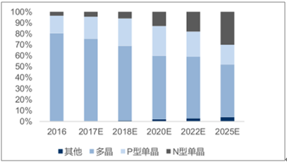 2016-2025年不同硅片市場(chǎng)占比變化趨勢(shì)