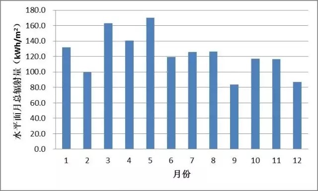而項目地區(qū)Meteonorm數(shù)據(jù)總輻射量(1981~2010年多年平均)月際變化情況見下圖。12月份全年最小!