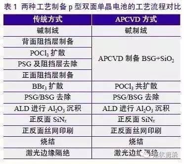 雙面電池典型的結(jié)構(gòu)是兩個高摻雜區(qū)域:一個硼摻雜的發(fā)射極和一個磷摻雜的發(fā)射極。傳統(tǒng)工藝進行雙面電池的制備需要進行兩次擴散阻擋層的制備及兩次濕法化學(xué)去除阻擋層,工藝過程十分繁瑣,而這正是阻礙雙面電池工業(yè)化生產(chǎn)的絆腳石。使用APCVD制備兩種摻雜能有效簡化工藝過程。兩種工藝制備p型雙面電池的工藝流程如表1所示。