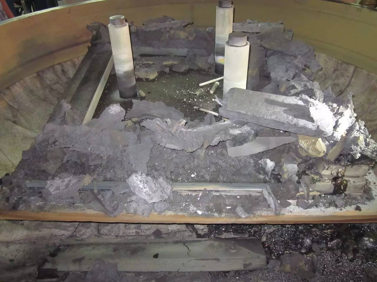 圖1、硅液溢流造成的熱場、硅料損失慘狀