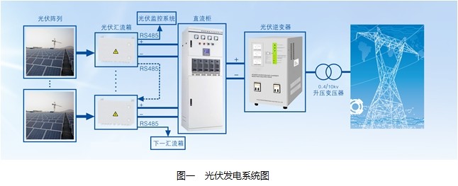 在太陽能光伏發(fā)電系統(tǒng)中,為了減少光伏電池陣列與逆變器之間的連線,以組串形式構(gòu)建光伏陣列,再將相應(yīng)數(shù)量光伏陣列并聯(lián)接入光伏匯流箱進行電能匯流,經(jīng)直流柜輸出給光伏逆變器,逆變升壓后并入電網(wǎng),因此完整的光伏發(fā)電系統(tǒng)包括光伏陣列組、光伏匯流箱、直流柜、光伏逆變器、升壓變壓器等部分。如圖一所示: