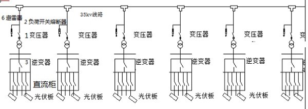 2、交流電經(jīng)100KVA變壓器1,直接升壓至35KV,變壓器、高壓隔離開關熔斷器、逆變器、避雷器等裝在一套箱變內(nèi)。