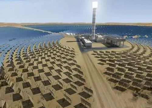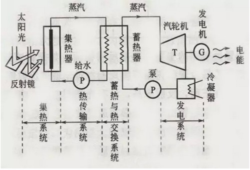 光熱發(fā)電技術(shù),是不同于光伏發(fā)電的全新的新能源應(yīng)用技術(shù)。它是一個(gè)將太陽(yáng)能轉(zhuǎn)化為熱能,再將熱能轉(zhuǎn)化為電能的過(guò)程。利用聚光鏡等聚熱器采集的太陽(yáng)熱能,將傳熱介質(zhì)加熱到幾百度的高溫,傳熱介質(zhì)經(jīng)過(guò)換熱器后產(chǎn)生高溫蒸汽,從而帶動(dòng)汽輪機(jī)產(chǎn)生電能。此處的傳熱介質(zhì)多為導(dǎo)熱油與熔鹽。通常我們將整個(gè)的光熱發(fā)電系統(tǒng)分成四部分:集熱系統(tǒng)、熱傳輸系統(tǒng)、蓄熱與熱交換系統(tǒng)、發(fā)電系統(tǒng)。