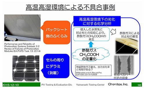 查明了劣化機(jī)制后,就能確定對(duì)策的方向。對(duì)此次的事例,已對(duì)封裝材料使用的EVA,采取了必要措施等,在由太陽(yáng)能電池板廠商和材料廠商努力加以改善。
