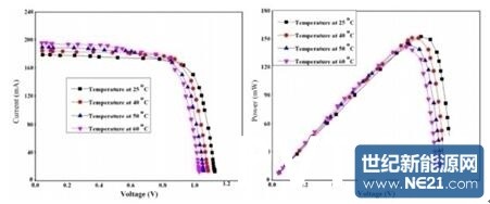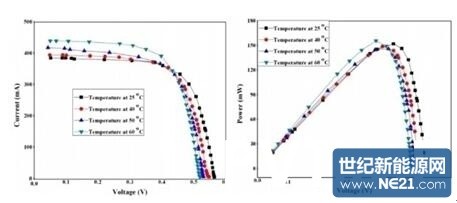 圖2.單個(gè)單晶硅太陽(yáng)能電池不同溫度條件下的I-V、P-V曲線。