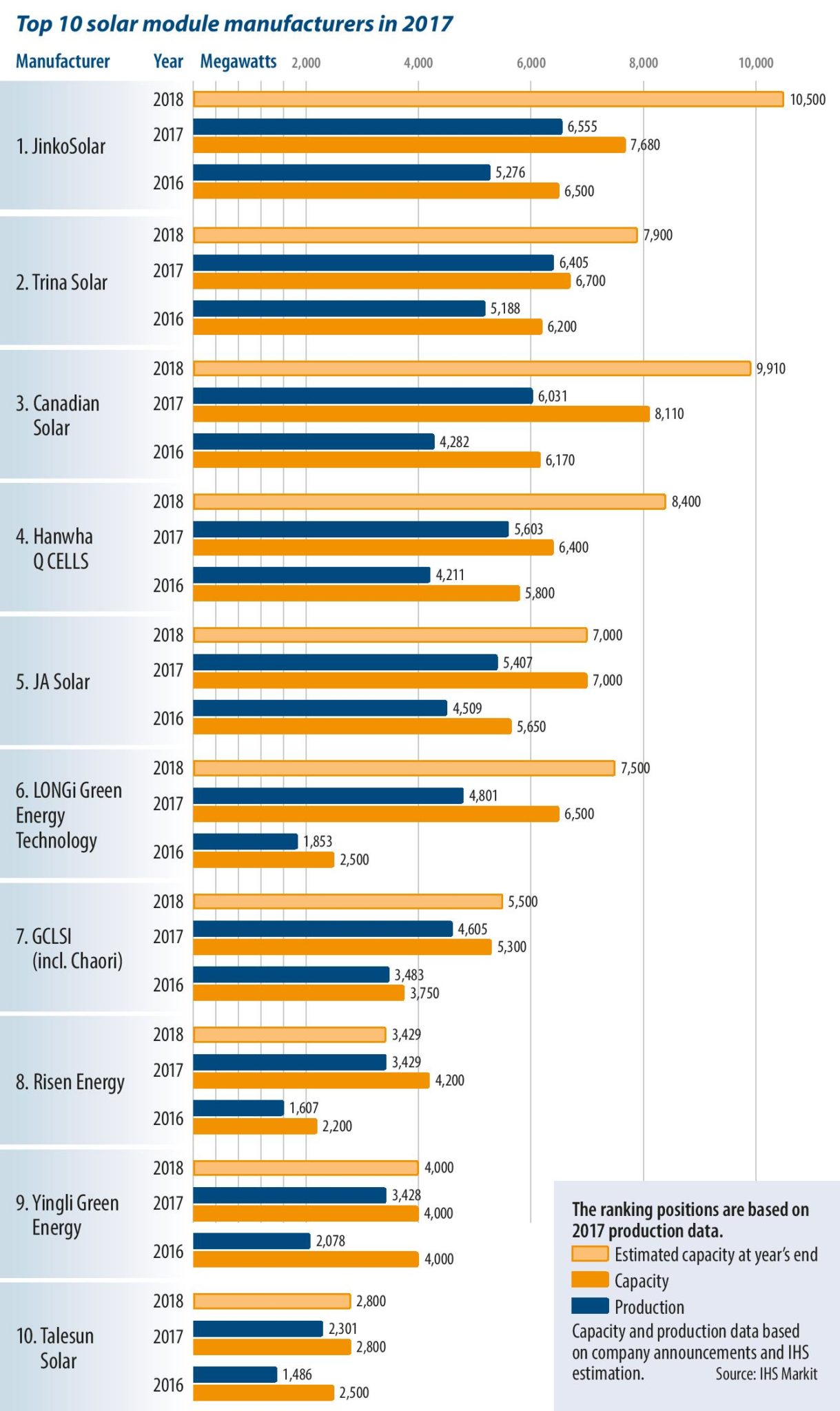 中國在供需方面都是主導(dǎo)者。 “2017年中國的全球市場份額約占53%。”IHS Markit高級分析師Karl Melkonyan表示。 “組件制造商還在繼續(xù)擴產(chǎn),2017年帶來了近10 GW的額外容量。”