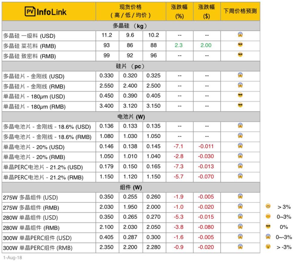 而多晶部分雖然受到單晶降價(jià)的壓力,但是由于目前市場(chǎng)的供需穩(wěn)定,因此部分廠商依舊抬高報(bào)價(jià),成交價(jià)也維持在原本的水位。另一個(gè)變數(shù)就是匯率的變化,海外價(jià)格在匯率的影響下,美金成交價(jià)甚至較上周微幅向下修正,因此隨著匯率的變化,海外價(jià)格可能不會(huì)看到上漲。同時(shí),隨著單、多晶產(chǎn)品需求的變化,多晶在八月中下旬一樣可能又要面臨一波下殺的壓力。