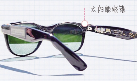 德國(guó)科學(xué)家發(fā)明了一款基于半透明有機(jī)太陽(yáng)能電池材料的眼鏡,可以利用太陽(yáng)能為手機(jī)充電。這款太陽(yáng)能眼鏡的鏡片與普通鏡片相似,厚度為1.6毫米,重6克。眼鏡上有一個(gè)微處理器和兩個(gè)電量顯示器,能夠顯示太陽(yáng)光照強(qiáng)度以及周圍環(huán)境溫度。