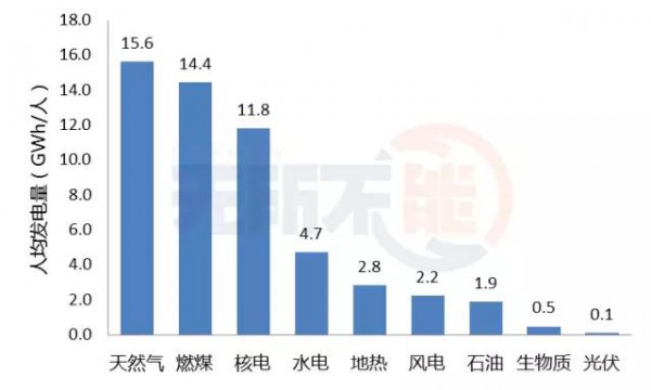 如果考慮人均發(fā)電量的話,光伏只有0.1GWh/人,不到天然氣、燃煤和核電的百分之一,比同是可再生能源的風(fēng)電也低了很多。