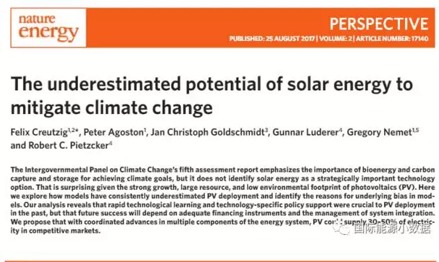 德國(guó)墨卡托研究所(Mercator Research Institute)的研究人員在最近一期《自然˙能源》雜志上發(fā)表題為T(mén)he underestimated potential of solar energy to mitigate climate change(太陽(yáng)能減緩氣候
