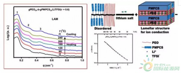 該含剛性聚合物側(cè)鏈的雙親嵌段共聚聚合物刷的鋰鹽復合體系,在高溫下具有高的離子傳導率,有望解決目前市場上使用的鋰離子電池的安全隱患等問題,可大大提高電池的安全性,應(yīng)用于火箭,衛(wèi)星或者飛行器等需要承受高溫場合的高溫下使用的鋰離子電池。