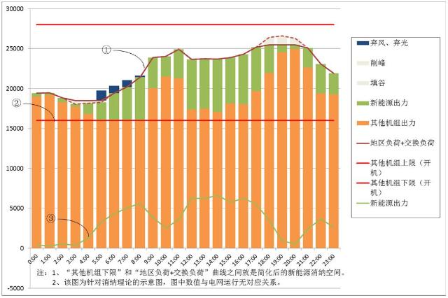 圖中曲線1代表電網(wǎng)日負(fù)荷曲線,基本構(gòu)成一般是地區(qū)負(fù)荷與區(qū)域間交換負(fù)荷之和;直線2代表本地區(qū)除新能源外,各類機(jī)組理論上能實(shí)現(xiàn)的綜合最小出力;曲線3表示新能源機(jī)組出力??梢钥吹?,曲線1和直線2之間的空間是新能源的消納空間,直線2與曲線3(綠色柱)計(jì)算疊加后,仍然超過曲線1的部分(藍(lán)色柱)就是棄電量。