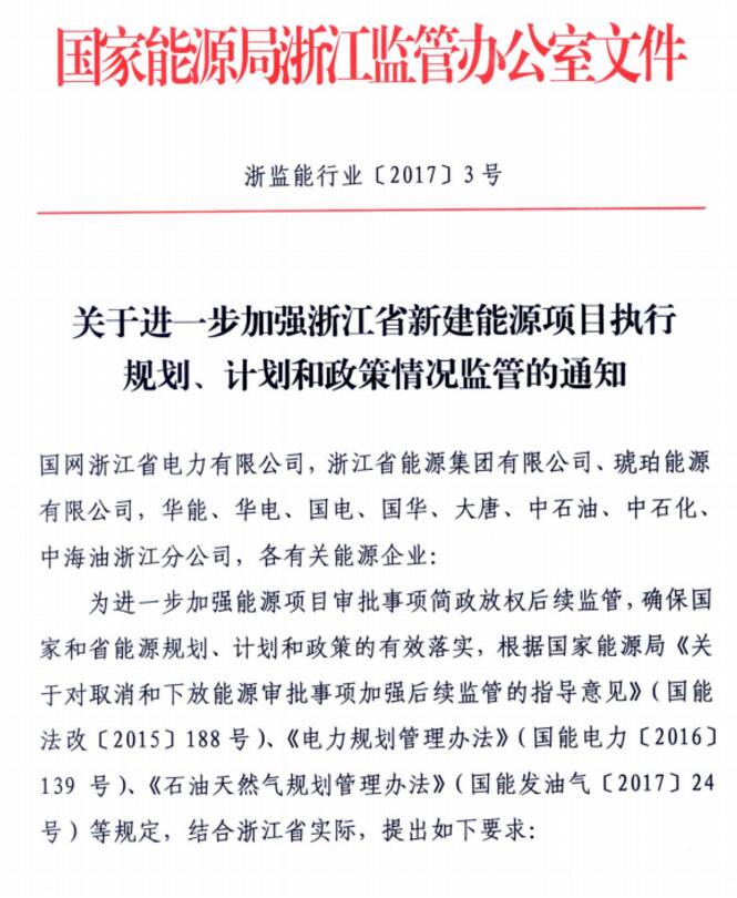 1月9日,國家能源局浙江監(jiān)管辦公開發(fā)布《關(guān)于進一步加強浙江省新建能源項目執(zhí)行規(guī)劃、計劃和政策情況監(jiān)管的通知》,《通知》要求,浙江省新