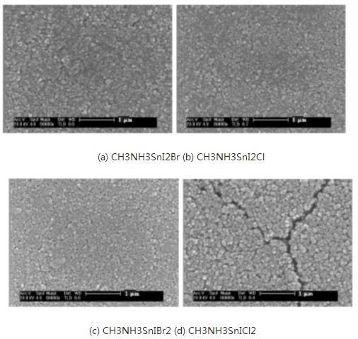 圖1是不同成分的鈣鈦礦薄膜的SEM形貌圖,4種成分的鈣鈦礦薄膜均是在100℃下經(jīng)過5min退火而得到。與CH3NH3SnI3薄膜SEM圖(見圖1)相比,Br-與Cl-引入過多時(shí),過多的Br-與Cl-可能在結(jié)晶的過程中產(chǎn)生某種中間產(chǎn)物,從而減慢了鈣鈦礦的結(jié)晶速率,并且由于Br-、Cl-與I-存在較大的原子尺寸差別,從而導(dǎo)致晶格發(fā)生畸變,結(jié)晶過程也會(huì)延長,退火處理的時(shí)間也需要相應(yīng)延長。所以退火溫度為100℃時(shí),在相對(duì)較短的5min退火時(shí)間內(nèi),如圖1(c)所示,CH3NH3SnIBr2薄膜的晶粒大小不均一。而圖1(d)中,由于退火時(shí)間較短,CH3NH3SnICl2薄膜的晶粒較粗大,且薄膜表面不夠平整和致密。圖6(d)薄膜上面出現(xiàn)大裂紋是由測SEM時(shí)的高電壓所導(dǎo)致的薄膜開裂。