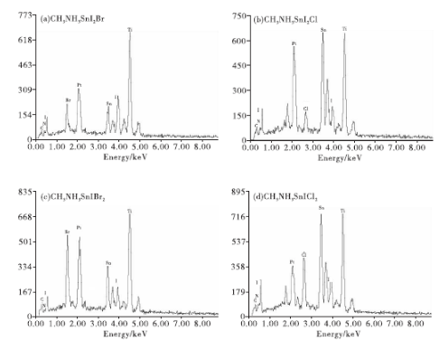 CH3NH3SnI3成分的鈣鈦礦薄膜具有最低的禁帶寬度增加,降低其在可見光范圍內(nèi)的吸光性能,過多的Br-、Cl-會(huì)導(dǎo)致鈣鈦礦薄膜結(jié)晶性能降低。