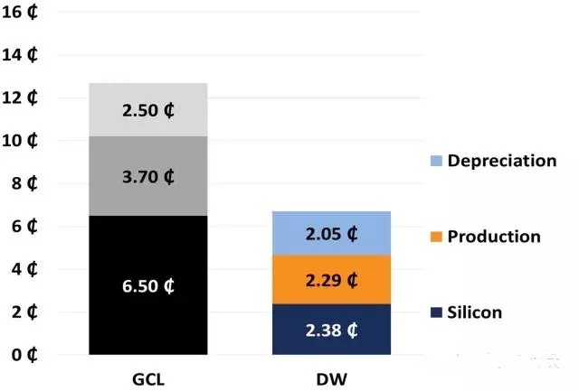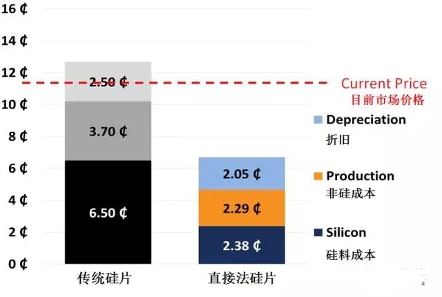 與傳統(tǒng)硅片的成本相比,直接法硅片的成本大幅降低,如下圖。